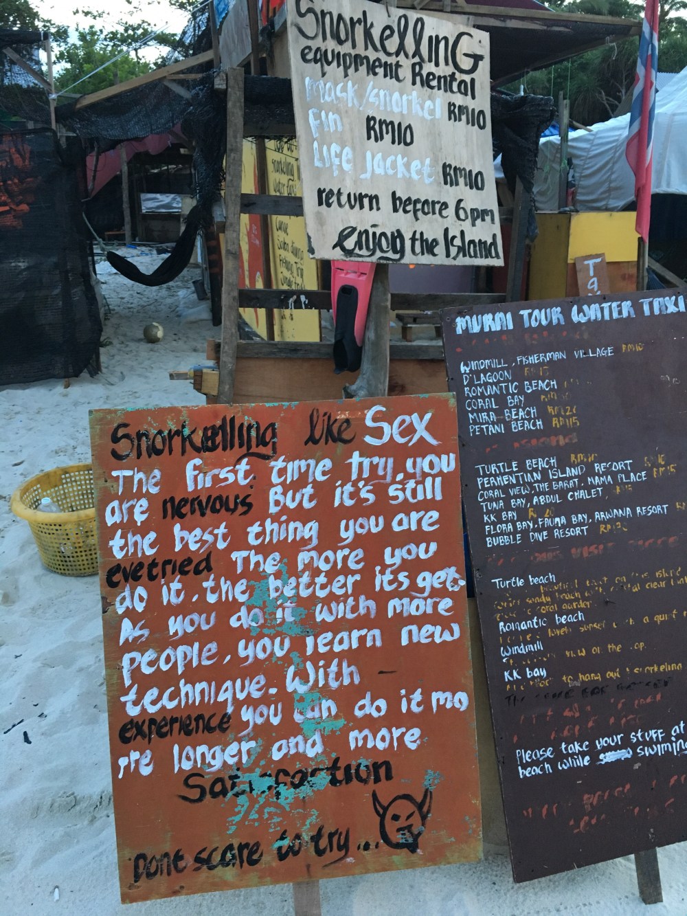 Price: Accommodation ranges from budget backpacker to luxurious traveler whereas food can be found for less than RM 50 per meal, inclusive of drinks, (and even then, the cost of a large pizza at Oh La La is RM 30) unless you decide to eat at the high-end hotels. As for activities, most snorkeling or island-hopping trips cost RM 50 to RM 75, with the most expensive being RM 100 per person but don’t choose those packages as you’re being ripped off.