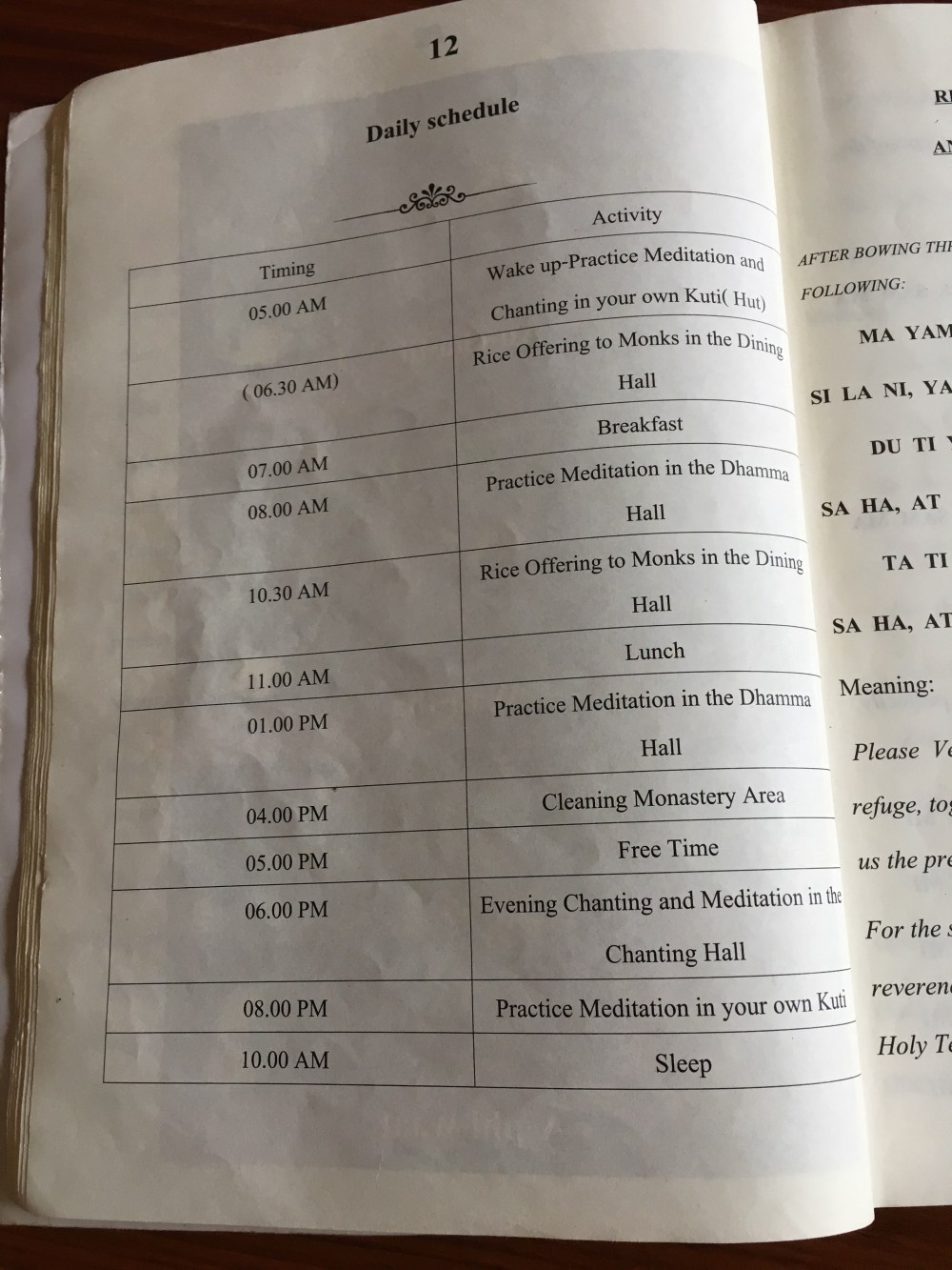 What To Expect: My friend and I arrived mid afternoon meditation so waited with others until we could register at 3pm, in the Dhamma Hall; during registration, we were briefed on the code of conduct at the monastery – with some examples of what is not allowed being: singing or music of any type, smoking, drinking alcohol, gambling, and yoga (but you can practice privately in your hut). The daily schedule is as follows: