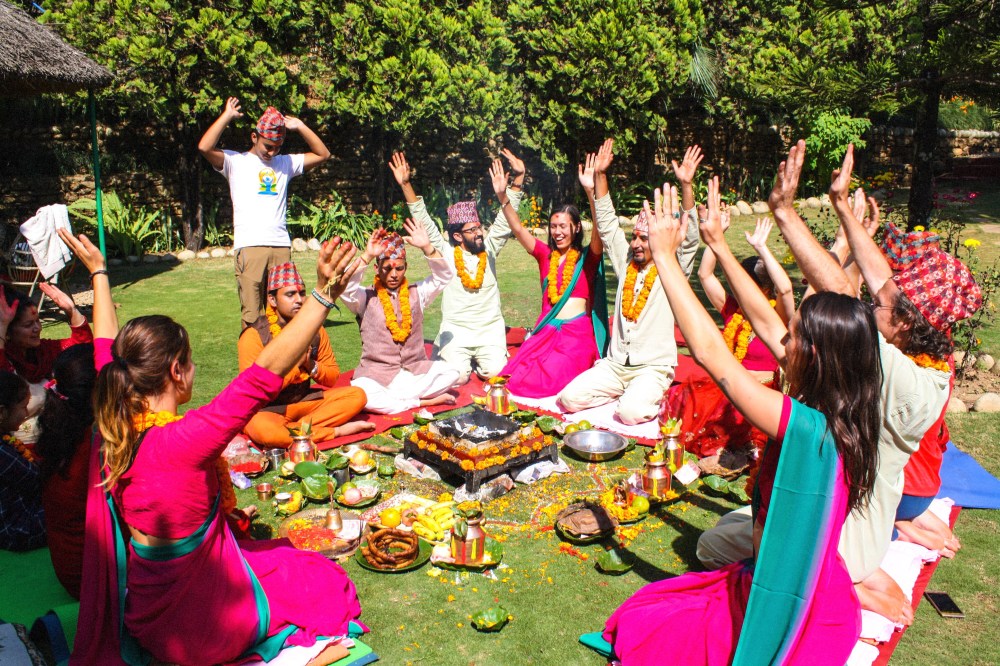 I am genuinely grateful for each and every person I met at The Himalayan Yoga Academy – and I met many! Despite how all the interactions were unique, there was a shared factor: how each of our consciousness expanded by connecting with, and learning from, people from around the world. Again, I want to thank each and every one of you for being you (if you’re reading this, that is) and, of course, want to also thank the instructors at the academy for extending an overwhelmingly warm welcome to us – I genuinely felt like a part of the family, and I know my classmates did, too. The fact that we even managed to celebrate local festivals together (including the resort guests) was just an added bonus! Pictured below is my guru on Dashain, as it is tradition to touch or use a swing on the main day of the festival in order to be closer to the cosmos.