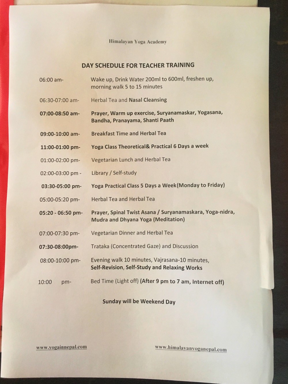 If youβre curious about what else to expect during the 200 hours yoga teacher training course at The Himalayan Yoga Academy then know this: your day begins at around 6 am as at 6.30 am you will practice a nasal cleansing technique known as βjala netiβ – honestly, considering the dust in Nepal, your nasal cavity will thank you for the cleanse. After that, a two-hour class will commence, with the remainder of the day as follows: