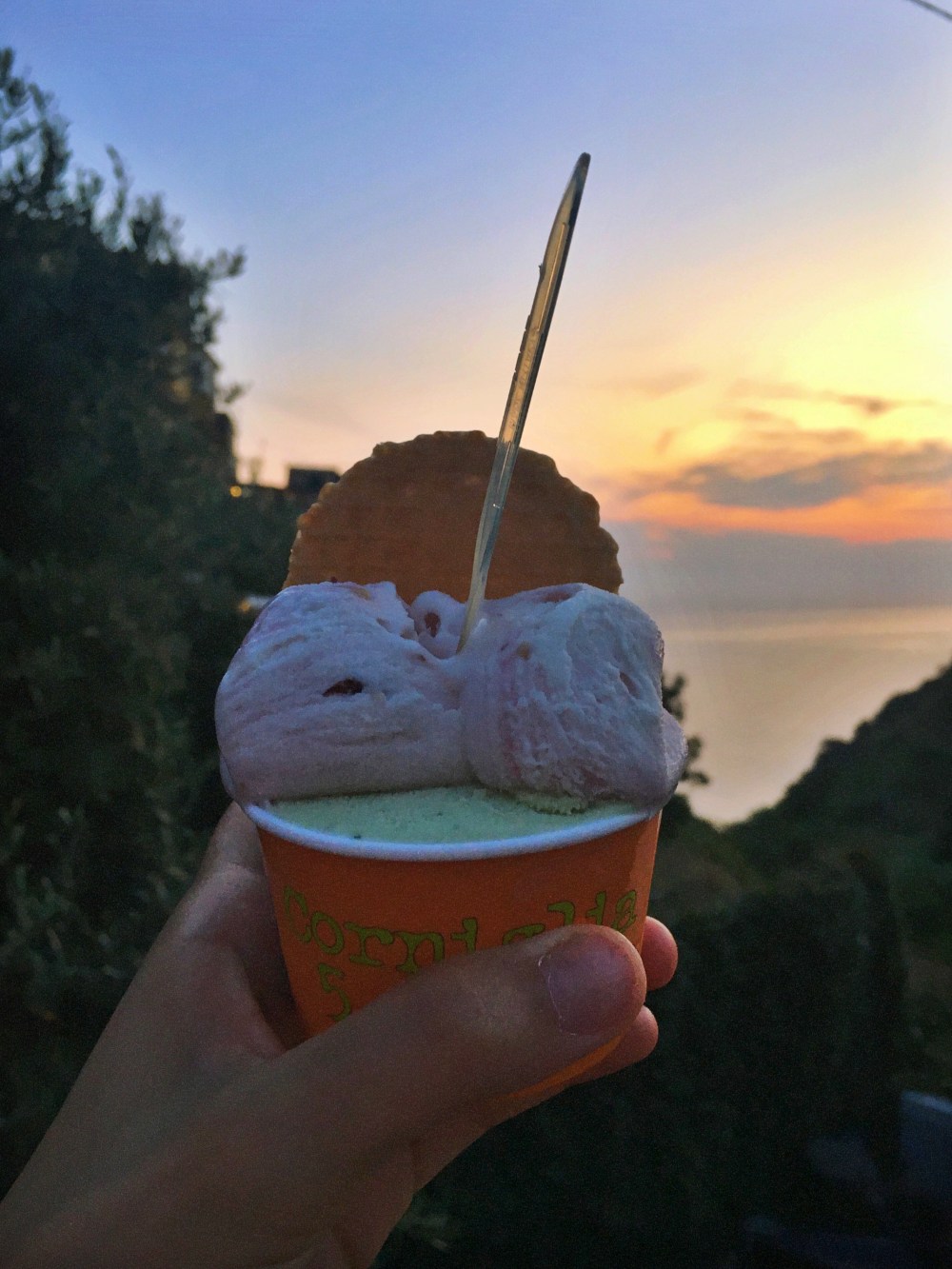 Other Recommendations: The region of Cinque Terre is known for its fresh produce, mainly its anchovies, lemons, and basil. In fact, pesto (pictured above) originates from Cinque Terre (or so they say)! So whilst visiting, it is a must to indulge in local pasta, known as trofie, drenched with pesto while sipping a lemonade – if you’re not vegetarian then of course, with a side of just caught anchovies. Speaking of diet restrictions, there are gluten-free options available around Cinque Terre and I noticed that Manarola had the most, from gluten-free dough delicacies to dessert delicacies. To end on a sweet note, I feel that it is mandatory to experience the basil gelato in Corniglia, at Alberto Gelateria, at least once in your life – the flavour of it is indescribable but in the best way possible. Pictured below is the basil gelato combined with cherry gelato (another recommendation).